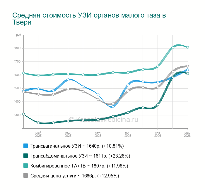 Сделать УЗИ органов малого таза у женщин в Твери можно в 66 клиниках. Средняя цена - 1509р. (+3.93% за последние 3 месяца). Всего найдено 153 цены от 400 до 2500 руб.