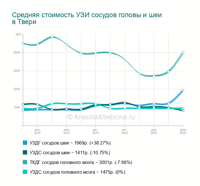Сделать УЗИ сосудов головы и шеи в Твери можно в 62 клиниках. Средняя цена - 1629р. (+4.96% за последние 3 месяца). Всего найдено 109 цен от 700 до 12300 руб.